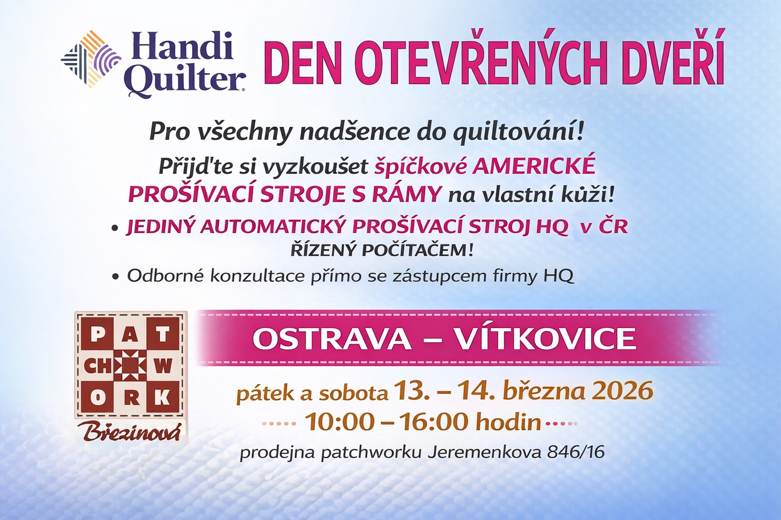 Zveme všechny zájemce na speciální dny otevřených dveří spojené s ukázkami amerických automatických prošívacích strojů HandiQuilter. Dozvíte se, jak fungují moderní longarm stroje, uvidíte praktické ukázky quiltování a získáte odpovědi na své dotazy. Akce je vhodná pro začátečníky i pokročilé patchworkářky a quiltařky.