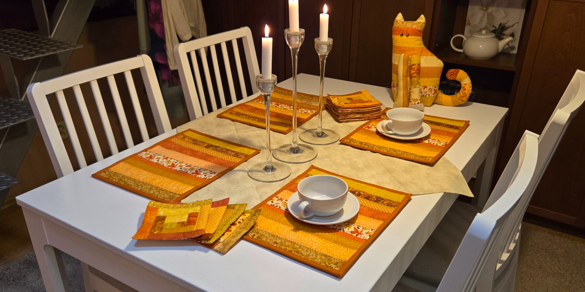 Tento kurz je vhodný pro začínající patchworkářky. Ušijete si prostírání na váš stůl. Naučíte se jak rychlým postupem ušít vzor Letící husy. A samozřejmě se naučíte lemování prostírky proužkem.